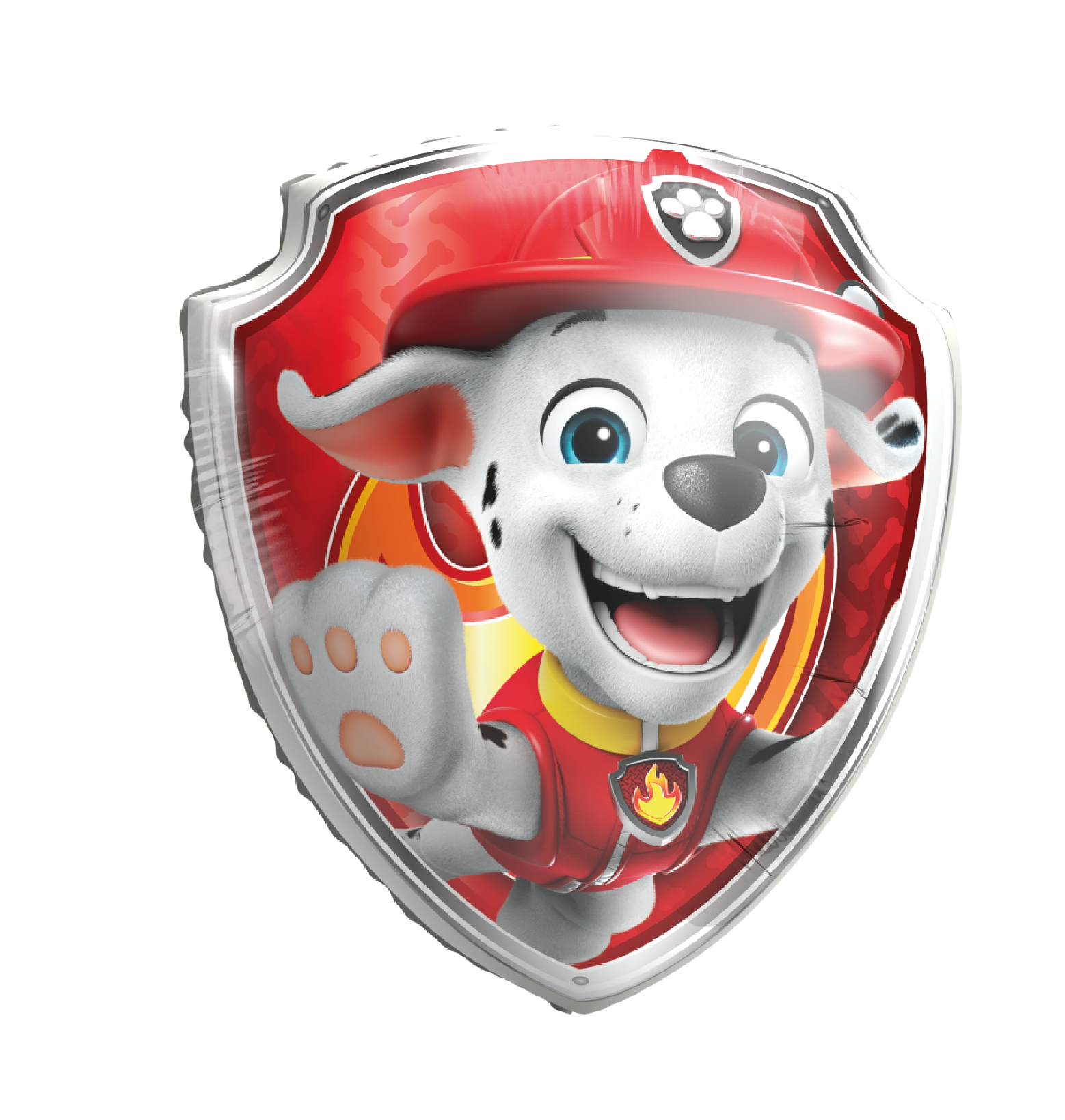 En flot folie-ballon med Paw Patrol-hunden Marshall, formet med præcis det kendte brandmand-motiv og med mål på ca. 79 × 73 cm.