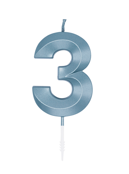 Giv kagen et friskt og stilfuldt udtryk med dette elegante kagetal i metallic lyseblå. Tallet “3” er perfekt til fødselsdage, jubilæer og nytår, hvor der ønskes et moderne og indbydende look. Lyset måler 6 cm og har en samlet højde på ca. 10,5 cm inkl. holder, hvilket gør det nemt at placere sikkert i både kager og desserter.