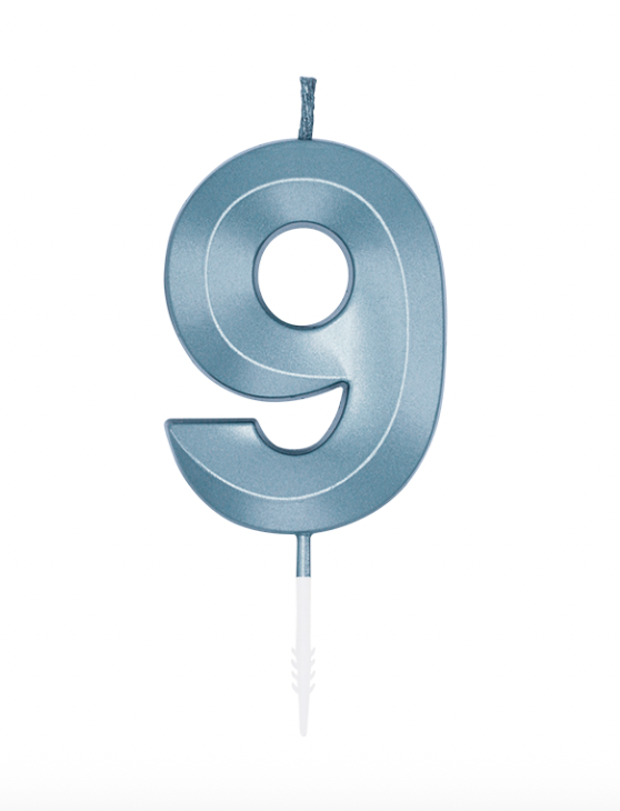 Giv kagen et friskt og stilfuldt udtryk med dette elegante kagetal i metallic lyseblå. Tallet “9” er perfekt til fødselsdage, jubilæer og nytår, hvor der ønskes et moderne og indbydende look. Lyset måler 6 cm og har en samlet højde på ca. 10,5 cm inkl. holder, hvilket gør det nemt at placere sikkert i både kager og desserter.
