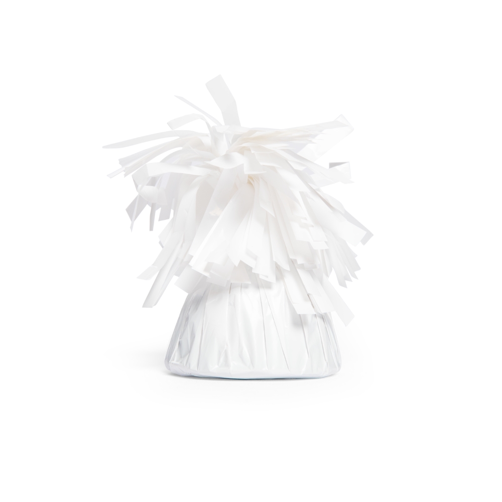 Hvid folie ballonvægt er en praktisk og stilfuld løsning til at holde heliumballoner sikkert på plads ved fester, events og dekorationer.